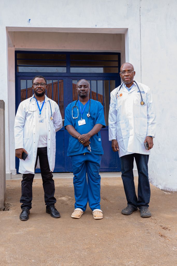 La photo montre trois médecins de la Clinique Agape posant devant la porte d’entrée de l’établissement. Elle reflète le professionnalisme, la disponibilité et l’accueil chaleureux du personnel médical. Cette image met en avant l’équipe dévouée qui veille au bien-être et à la santé des patients dès leur arrivée à la clinique.