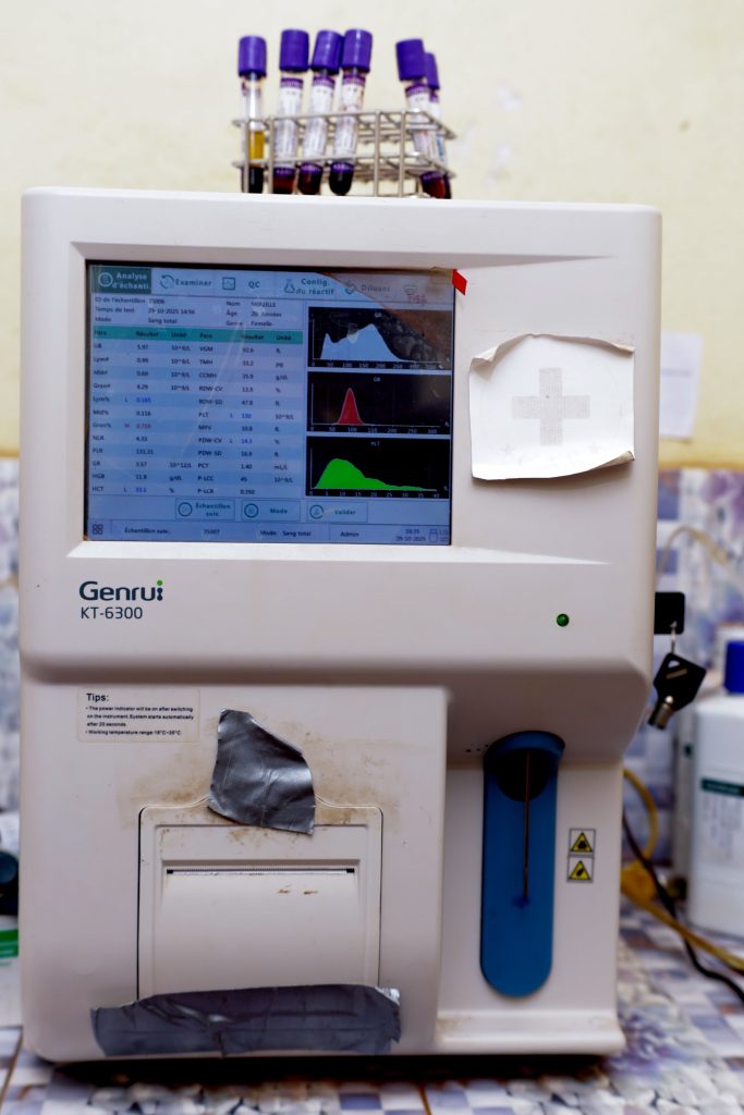 Cet appareil, le Genrui KT-6300, est utilisé au laboratoire de la Clinique Agape pour effectuer les analyses de sang complètes (NFS ou hémogrammes).